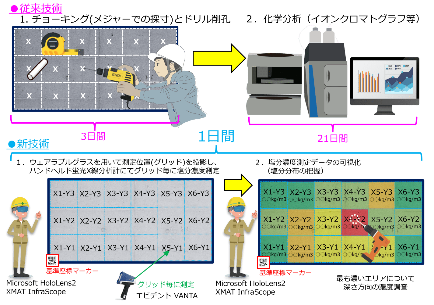 コンクリートの塩害は主要な劣化要因の1つと考えられます。凍結防止剤や潮風の影響等により、塩分がコンクリートに浸透することで鉄筋腐食等の劣化が進行するため、早期対策が求められております。従来のコンクリート塩分濃度調査技術は、チョーキングにより塩分濃度測定予定場所を指定し、ドリル削孔によりサンプル粉末を取得し、化学分析により塩分濃度を測定していました。このチョーキング・ドリル削孔・化学分析の主な作業は以下の通りで、多大な労力・時間を要することが課題でした。~各工程における主な作業~・チョーキング:寸法測定作業・マーキング作業・ドリル削孔:ドリル削孔作業・埋め戻し作業・化学分析:塩分濃度測定作業・報告書取りまとめ作業(上記工程にかかる総所要時間:約1ヶ月間(※1))