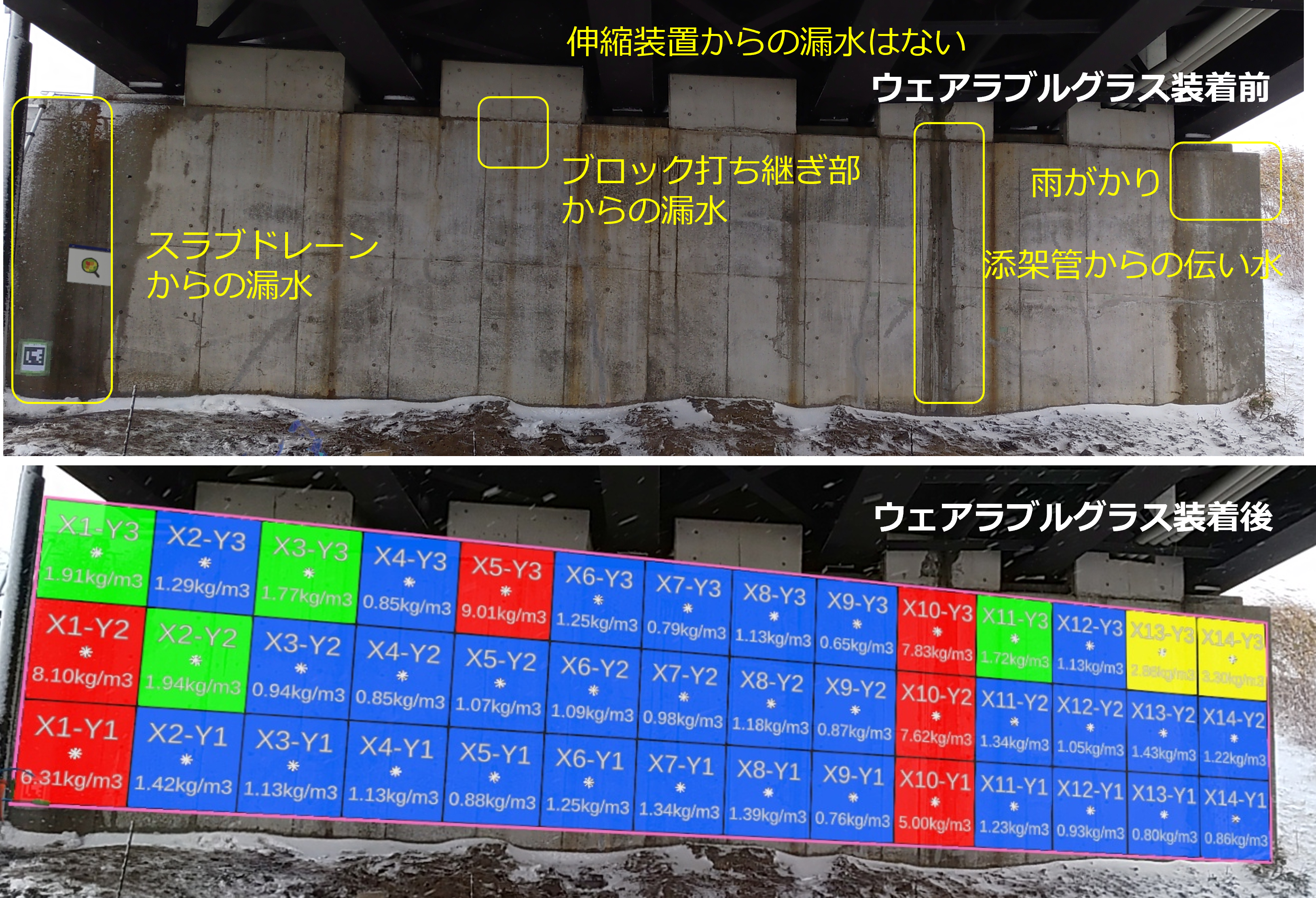 上記の画像は、道路橋の橋台における塩分濃度の計測結果を示したデモンストレーションです。ハンドヘルド型蛍光X線分析計を用いて取得した塩分濃度データを、ウェアラブルグラス上にヒートマップとして投影しております。従来のドリル削孔による調査では、サンプル採取数に制限があり、塩分分布を点的にしか把握できませんでしたが、本手法では面的に可視化することで、凍結防止剤(塩水)の浸透経路や滞留箇所を直感的に把握でき、予防保全の判断に役立ちます。これにより、ライフサイクルコストの低減が期待されます。尚、ヒートマップのセルサイズは任意に指定可能です。(上記画像のセルサイズは1m)